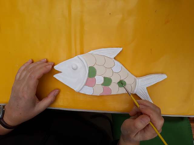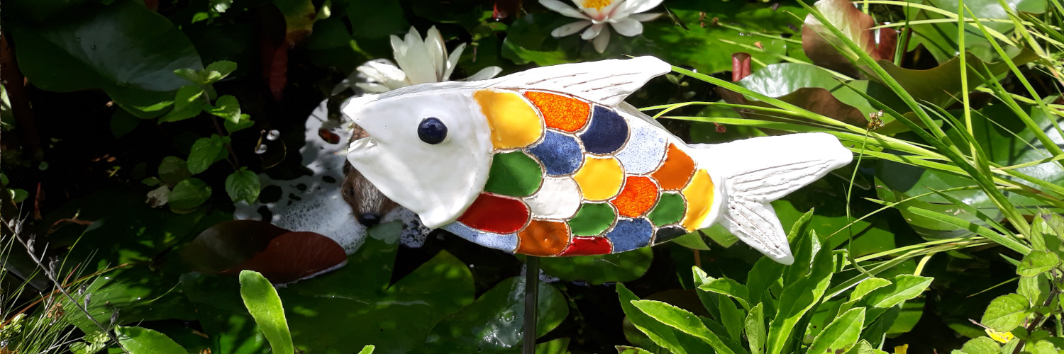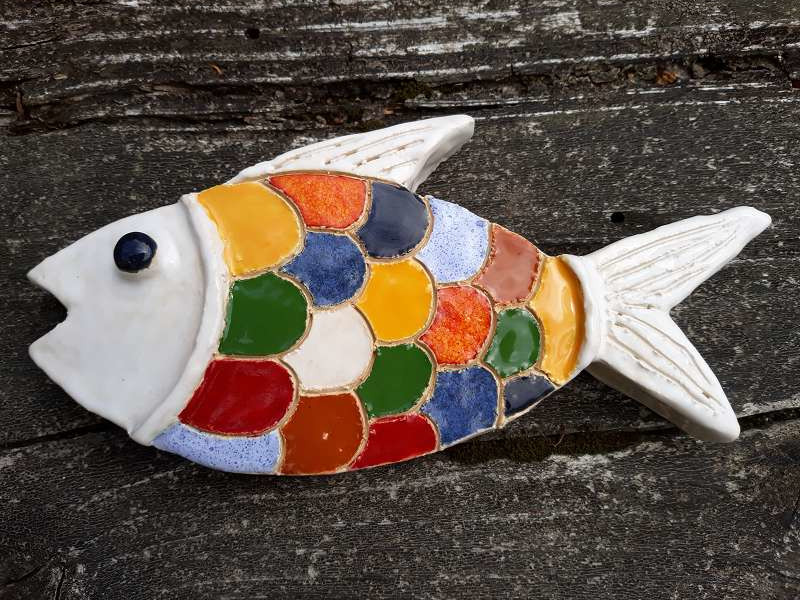 Der Fisch ist mit 10 verschiedenen Farben aufwendig glasiert. Jede Farbe wird mit einem feinen Pinsel mehrfach aufgetragen. Er wird mit einem Stab aus Stahl geliefert, der nicht fixiert ist, so dass Sie die Keramik-Figur im Winter abnehmen können. Die Rückseite ist nicht glasiert!