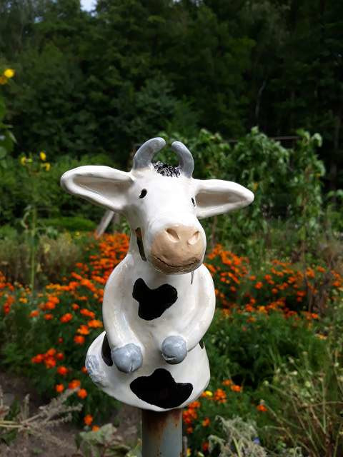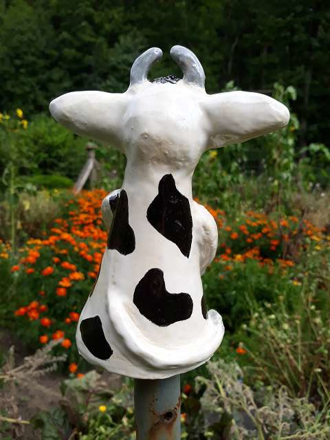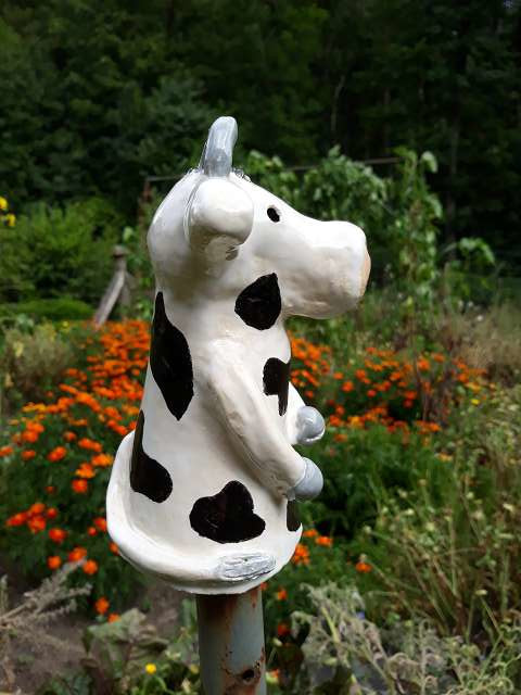 Kuh Lotte, die Schwarzbunte verbreitet gute Laune in Ihrem Garten.